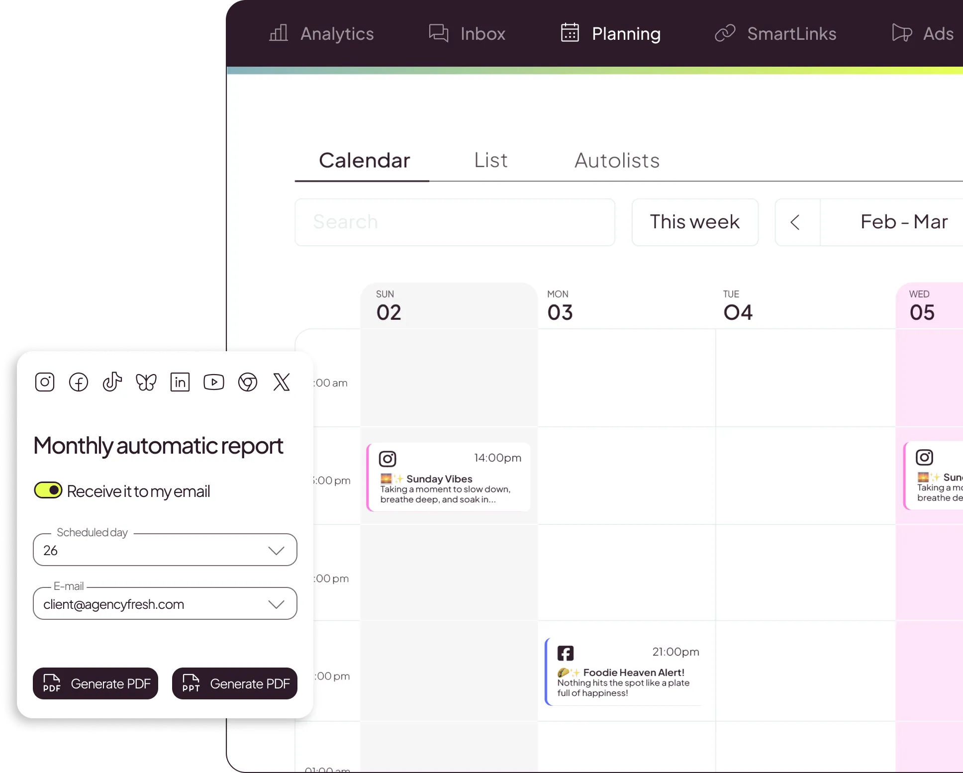 Nuestro planificador agiliza la programación de contenido para que reinviertas ese tiempo en lo que de verdad importa en tu agencia.