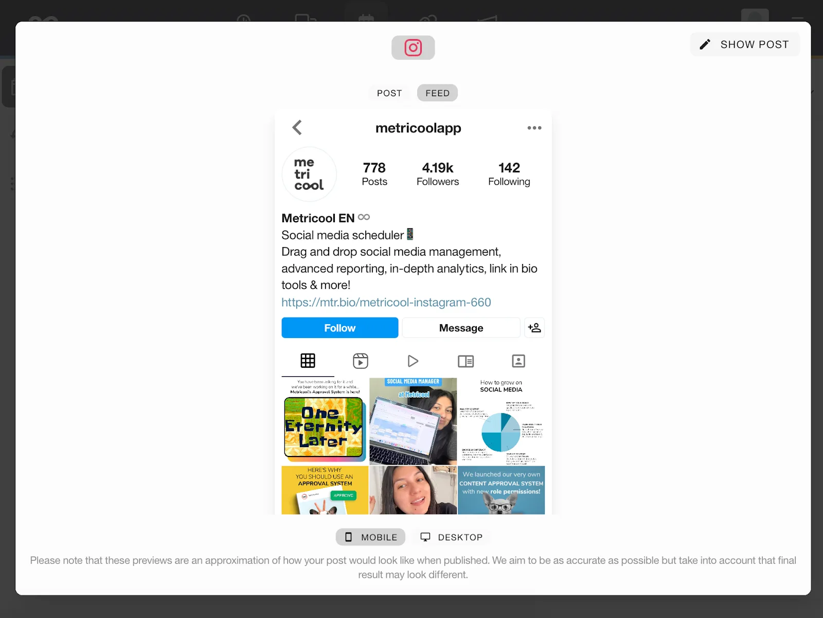 In the top right corner of the planner, you will see a “Show preview” option, where you can preview the content in your feed, for both mobile and desktop versions.